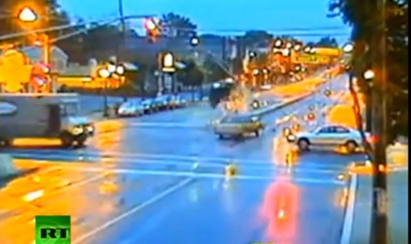 Ο οδηγός ενός αυτοκινήτου που τρέχει με ιλιγγιώδη ταχύτητα δεν σταματάει στο κόκκινο φανάρι και περνάει την διασταύρωση. Ένα αυτοκίνητο που ερχόταν κανονικά το χτυπάει στο πλάι και αυτό “απογειώνεται” και πέφτει πάνω στα φανάρια όπου τα ξεριζώνει!