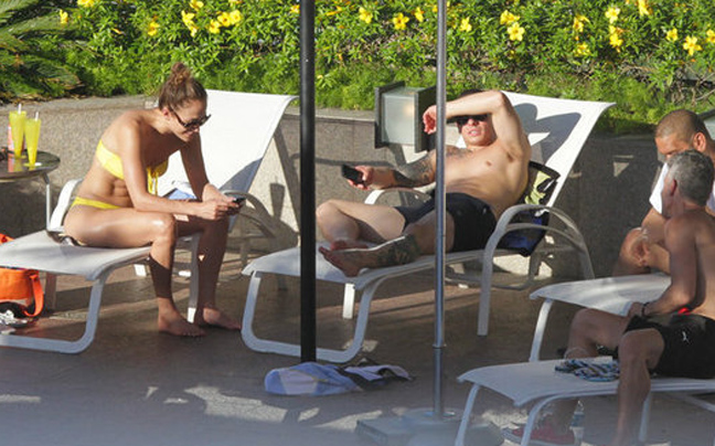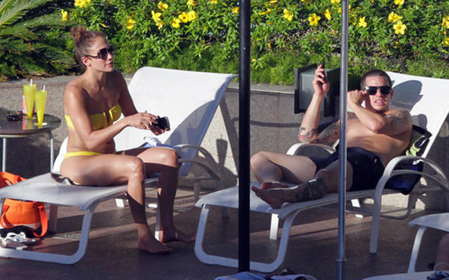 Μία... στάση στη Βραζιλία έκανε η Jennifer Lopez και ο Casper Smart για να ξεκουραστούν και να γεμίσουν τις μπαταρίες τους. Η λατίνα σταρ με ένα φωτεινό κίτρινο μπικίνι, που άφηνε να φανούν οι άψογοι κοιλιακοί της, χαλαρώνει στην πισίνα ξενοδοχείου. Το ζευγάρι αφού έγινε «μούσκεμα» από την ζέστη, έκανε τις βουτιές του και στη συνέχεια μοιράστηκαν και μερικά γέλια.